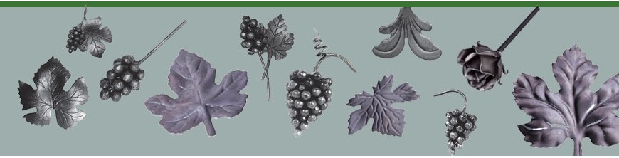 Feuillage, feuilles et fleurs décoratives en fer forgé, grappes de raisin massives, feuilles de vigne en métal,, feuilles fantaisie entrant dans les compositions de balustres et rambardes, roses sur tiges ...ect