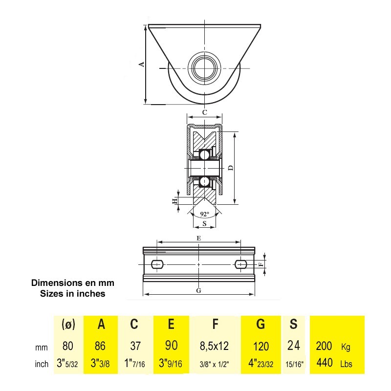 Roulette acier à gorge en V zinguée diamètre nominal ø80mm. A visser Cette roulette peut être utilisée pour des portails coulissants ou pour faire effectuer un déplacement de charge ou mettre en mouvement du mobilier ou des panneaux. La gorge en V permettra un guide optimal dans le rail.