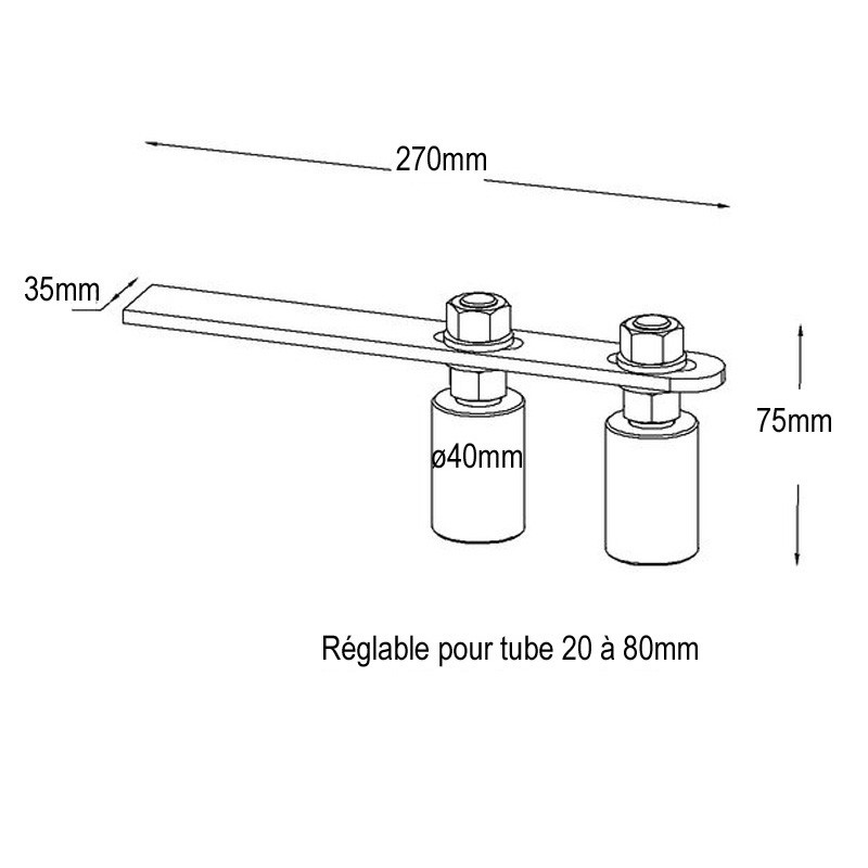 Rail de guidage fourni avec 2 galets Ø40mm à entraxe entièrement modulable pour s'adapter à l'épaisseur du portail. Les galets sont montés sur un plat à sceller . Pour portail largeur 20 à 80mm maximum.