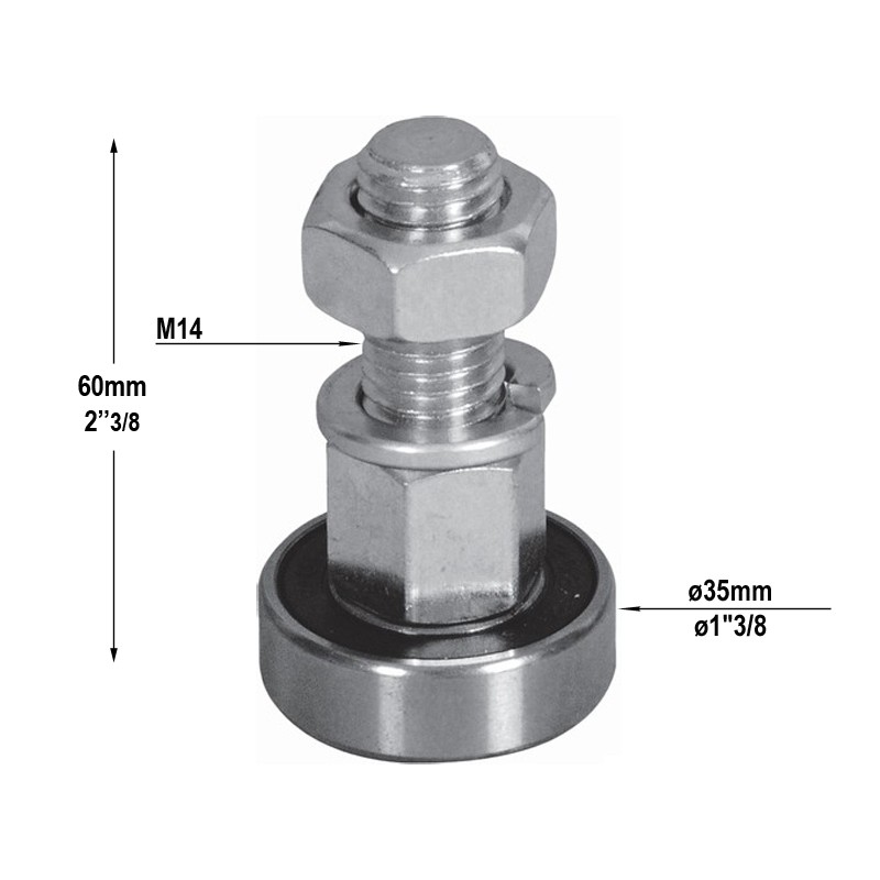 Ce galet de guidage M14 est en acier monté sur roulement à billes utilisé pour guider les mouvements des portails coulissants. Son axe principal est en acier zingué. Le roulement apporte une plus grande souplesse dans l'utilisation