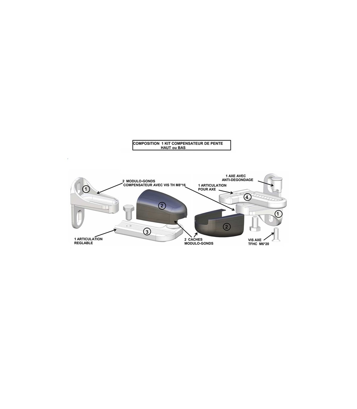 Ces articulations bénéficient de crantages anti glissement. Chaque régulateur de pente (haut et bas) repose sur une oreille afin d'éviter un affaissement du portail comme rencontré fréquemment sur ce genre de produit, et bénéficie en outre d'un anti dégondage du portail.