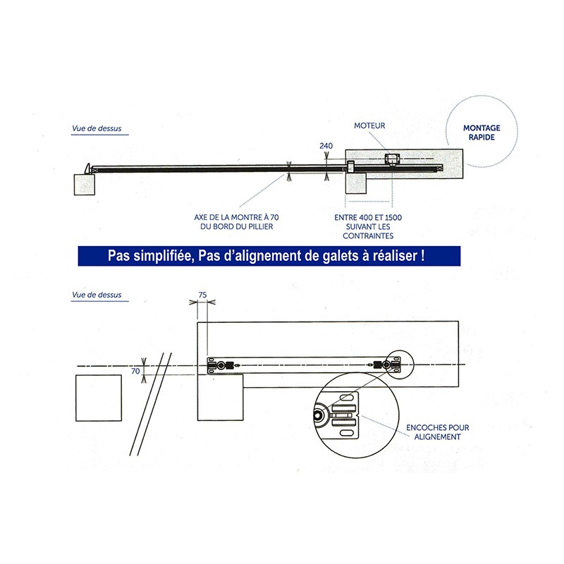 Il devra être utilisé avec un rail auto-portant référence FN36525 de 6,5m de longueur. Cet ensemble 2 chariots en acier est à fixer au sol (goujons non fournis). La position du moteur entre 400 et 1500mm dépend des contraintes de poids.