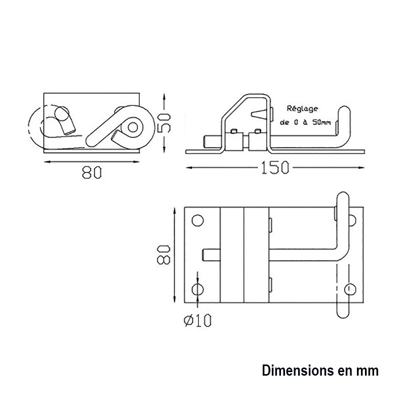 Sabot de portail en acier galvanisé à fixer avec butée réglable pour portails toutes épaisseurs jusqu'à 50mm. Ce portail est à fixer au sol par 4 vis à têtes fraisées 90° (non fournies)