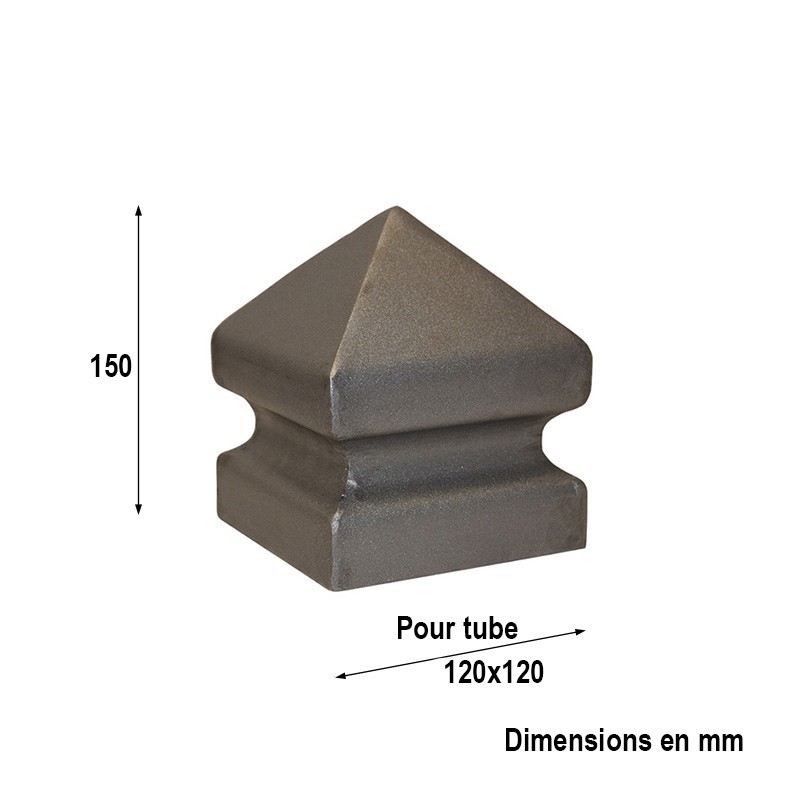 Ce couvre poteau en forme pyramidale couvre les poteaux en tube d'acier de 120x120mm. Il existe également pour tubes de 100x100mm voir article FN35851.