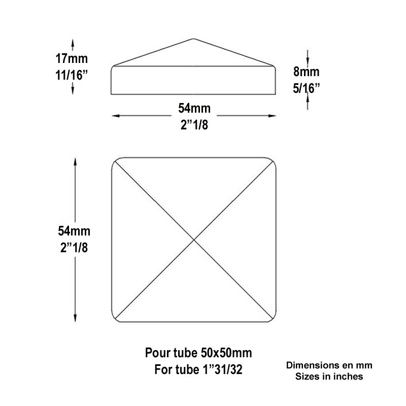 Couvre pilastre acier d'épaisseur 1,8mm pour tube de 50x50mm. Existe également pour tubes diamètre 30 à 120mm voir articles FN3576 à FN3581, ou en inox voir articles FN35811 à 3583, ou en aluminium, voir articles FN35831 à 35834