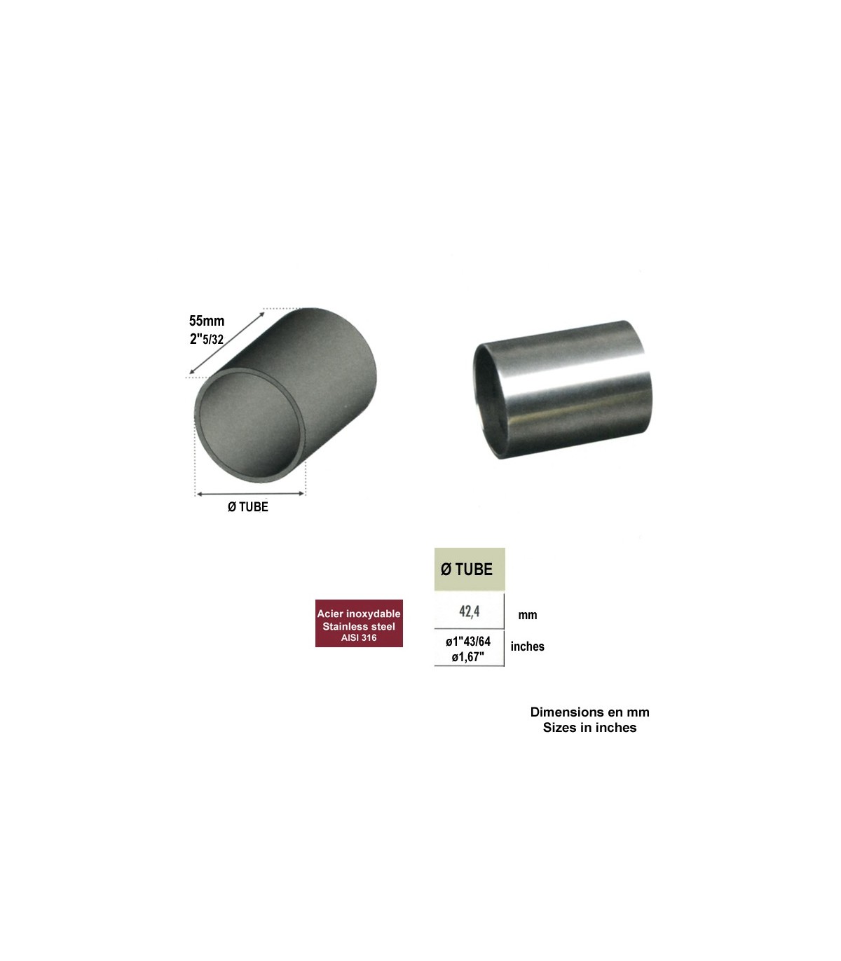 Ce connecteur union droit INOX pour main courante en bois Ø42mm est en acier INOX 316 brossé grain 320.