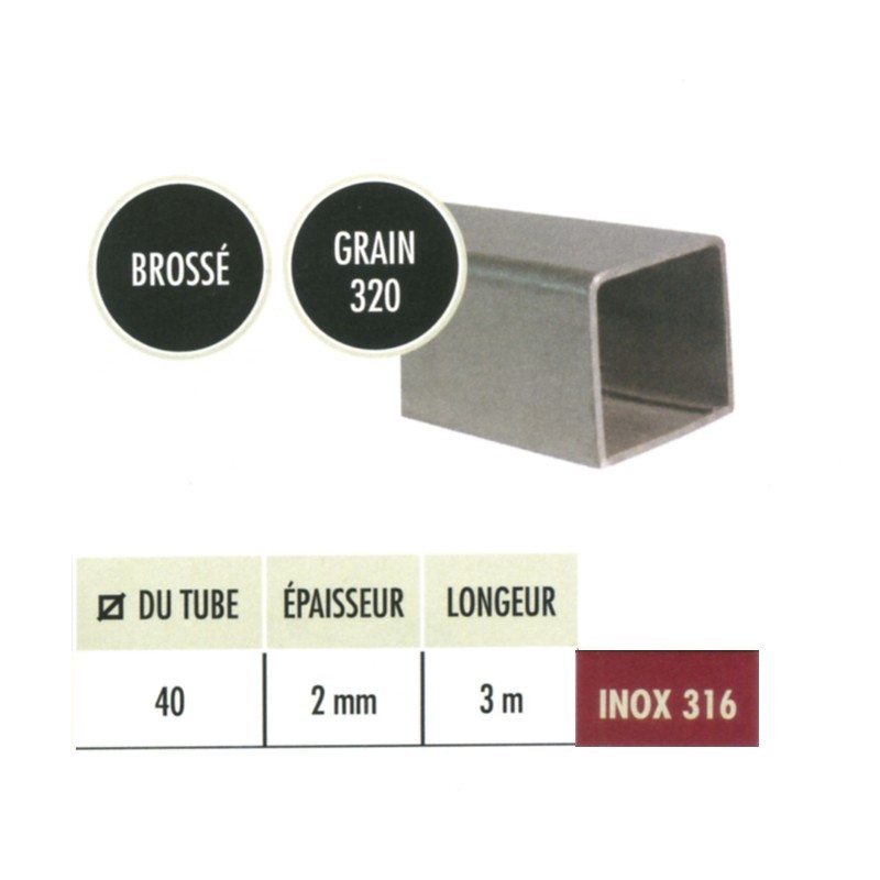 Ce tube carré de 40x40mm est en acier inoxydable INOX316, brossé avec un grain 320.