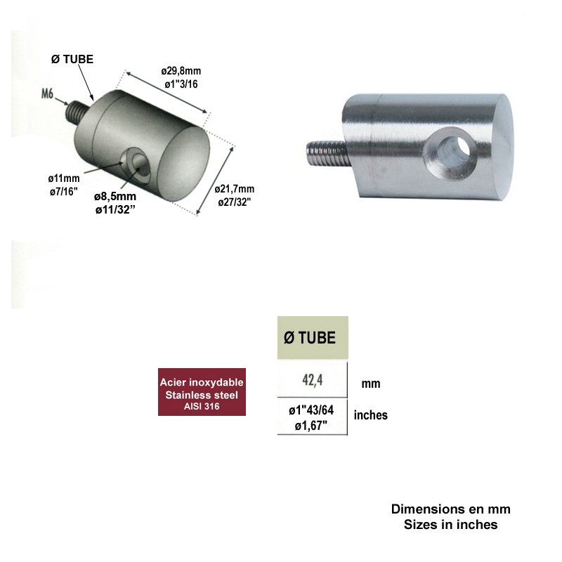 Il se fixe sur un poteau inox Ø42,4mm avec avec une vis incorporée ØM6.