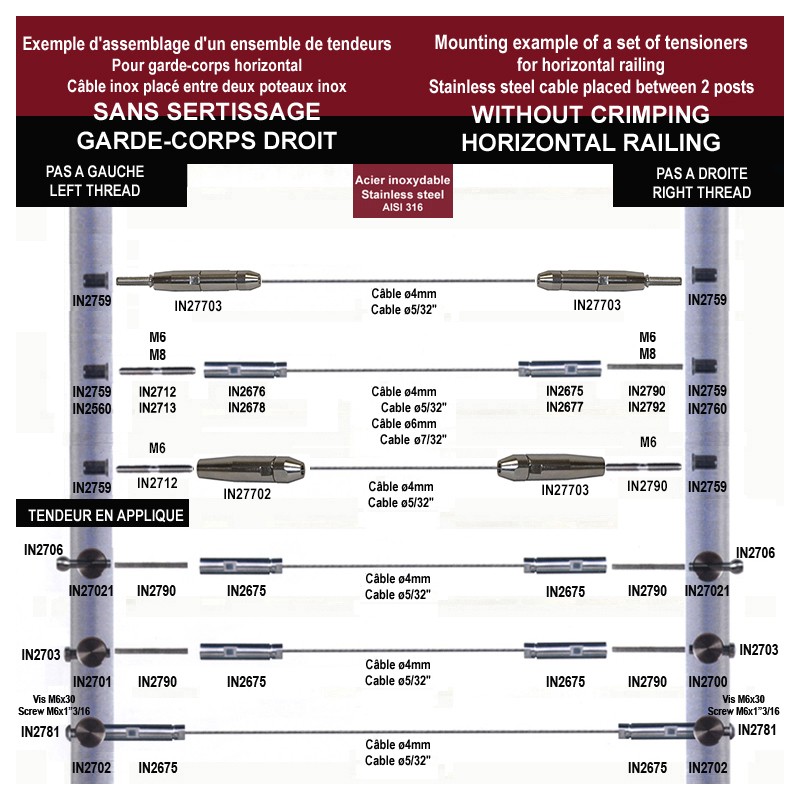 Une fois le câble mis en place dans les 2 fixations (une avec pas à gauche et une avec pas à droite) le serrage simultané des fixations sur les vis permettra de tendre le câble inox.