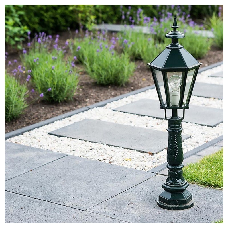 Ce bel ensemble de luminaire sur potelet est composé d'un luminaire faubourg hexagonal monté sur son potelet à base ronde de Ø 17cm.