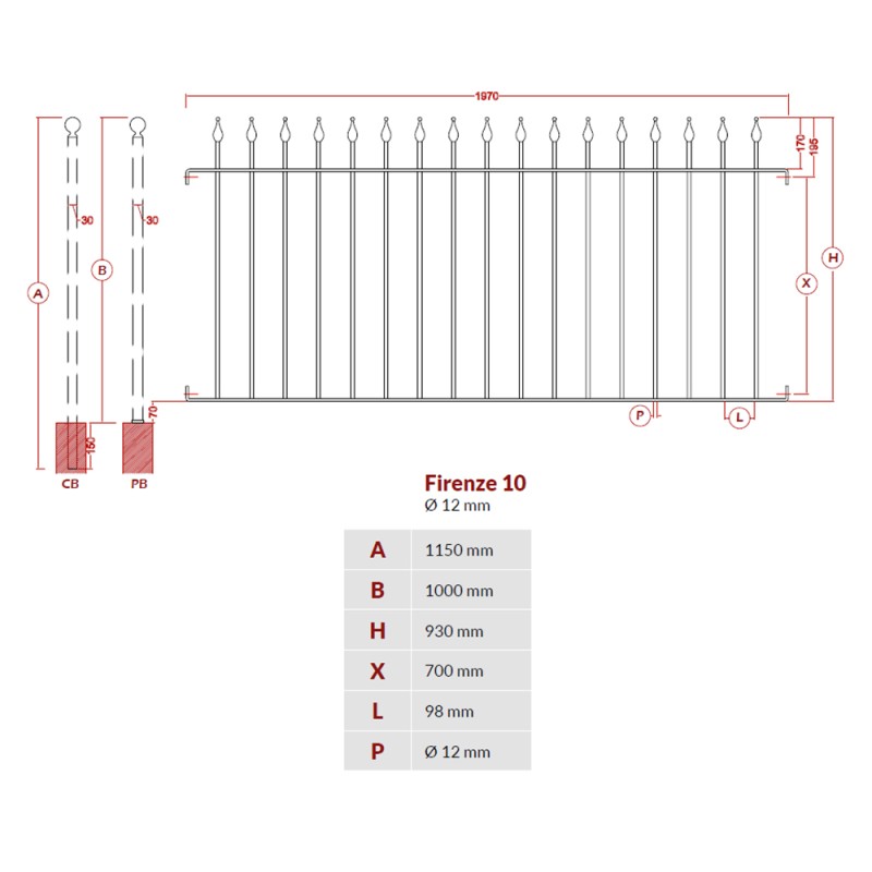 Grille de clôture en acier. Élément de 1970x930mm composé de 17 balustres espacés de 98mm.