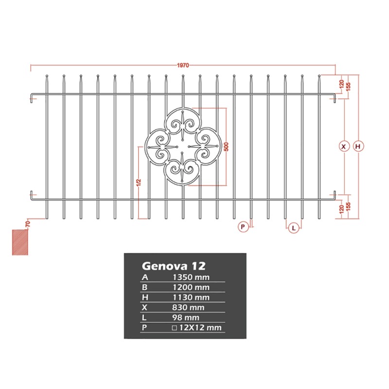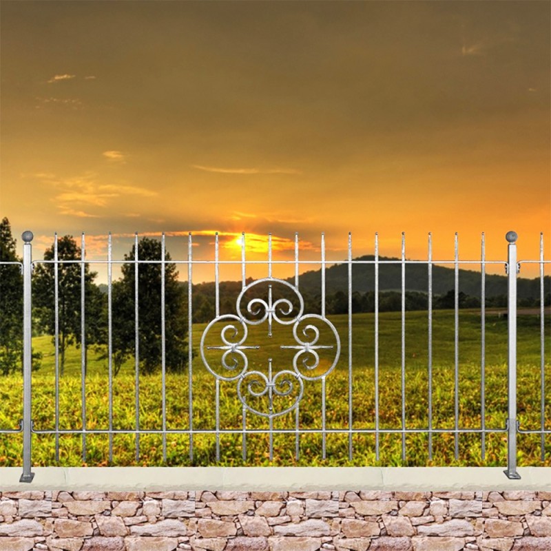 Grille de clôture en acier galvanisé. Élément de 1970x1130mm composé de 17 balustres espacés de 98mm.