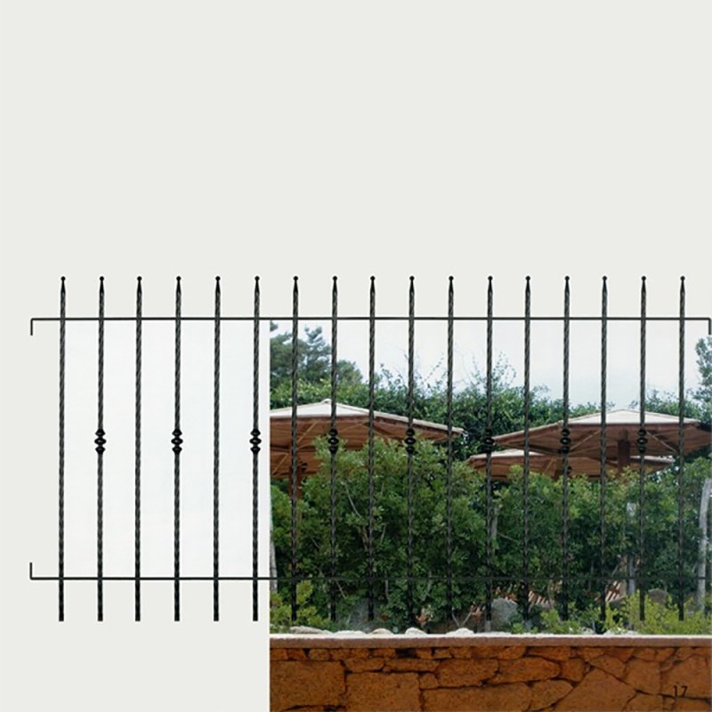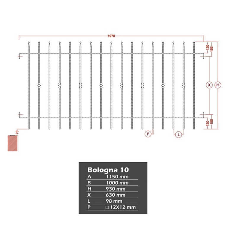 Grille de clôture en acier. Élément de 1970x930mm composé de 17 balustres espacés de 98mm.