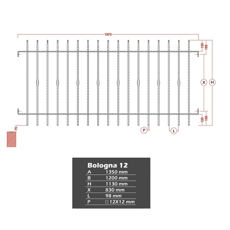 Grille de clôture en acier galvanisé. Élément de 1970x1130mm composé de 17 balustres espacés de 98mm.