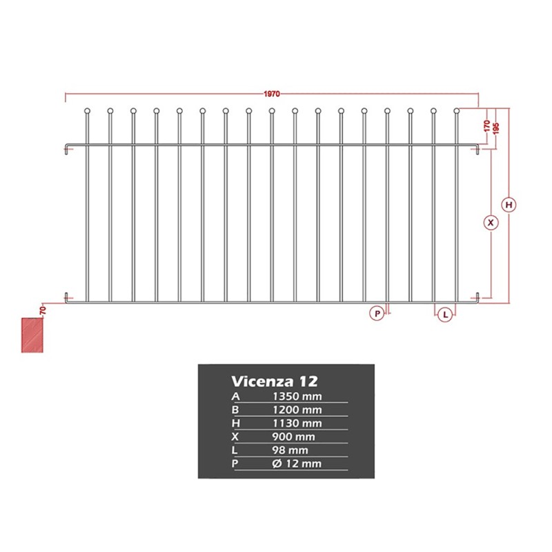 Grille de clôture en acier galvanisé. Élément de 1970x1130mm composé de 17 balustres espacés de 98mm.