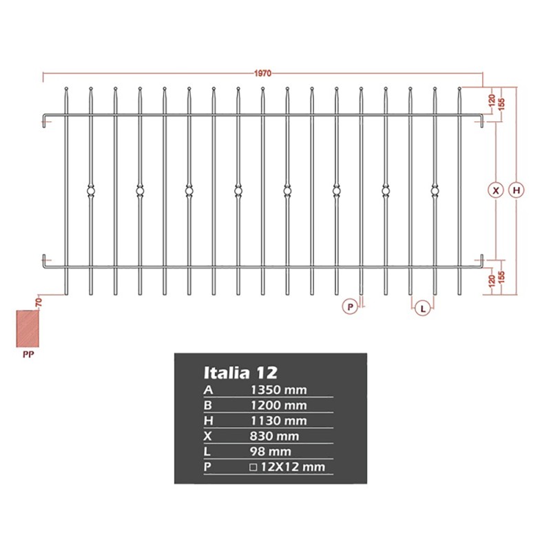 Grille de clôture en acier. Élément de 1970x1130mm composé de 17 balustres espacés de 98mm.