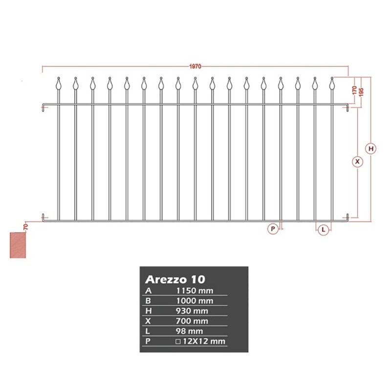 Grille de clôture en acier. Élément de 1970x930mm composé de 17 balustres espacés de 98mm.