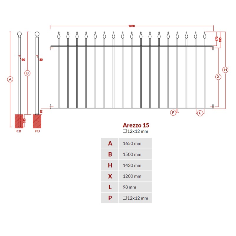 Grille de clôture en acier. Élément de 1970x1430mm composé de 17 balustres espacés de 98mm.