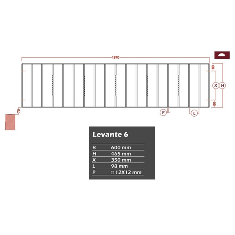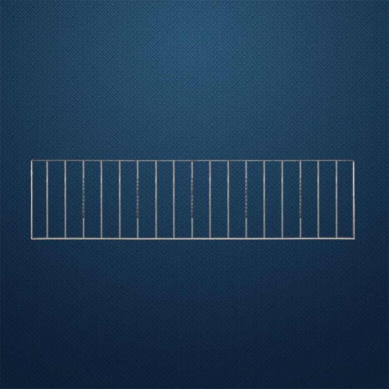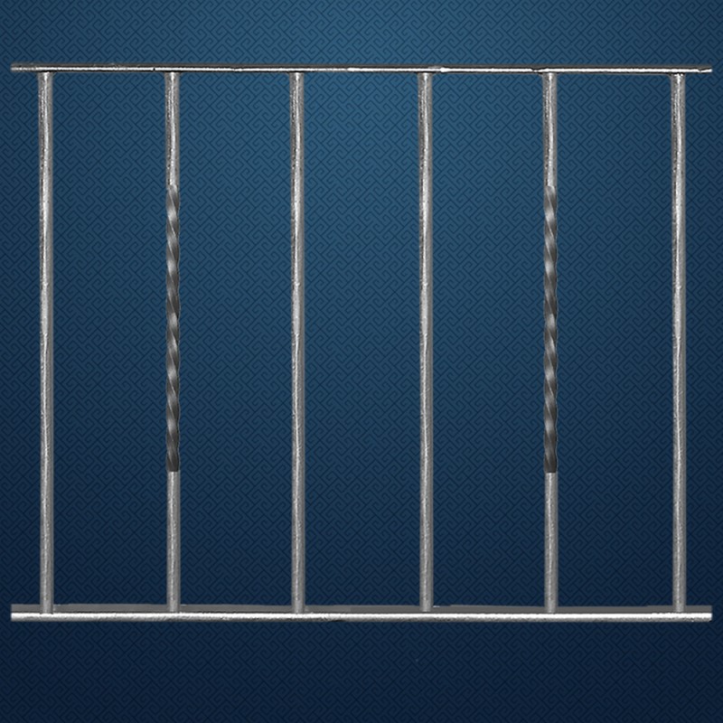 Grille de clôture en acier. Élément de L1970 x H465mm composé de 17 balustres espacés de 98mm en carré de 12x12mm, avec une torsade centrale pour 1 balustre sur 3.