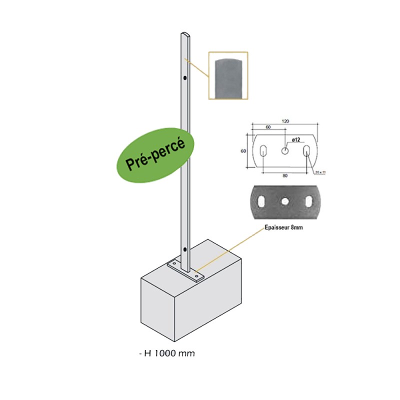 Ce poteau à fixer hauteur 1000mm est constitué d'un fer plat de 30x8mm sur platine pré-percée à boulonner.