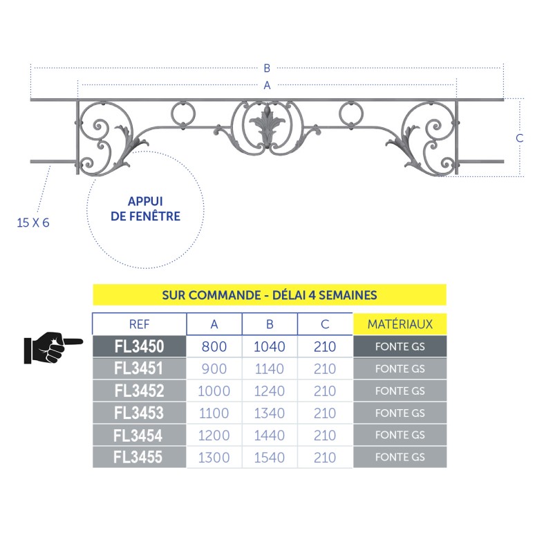 Cet appui de fenêtre en fonte ductile GS est livré prêt à poser en tableau. Ce modèle convient à des fenêtres de largeur 800 à 950mm.