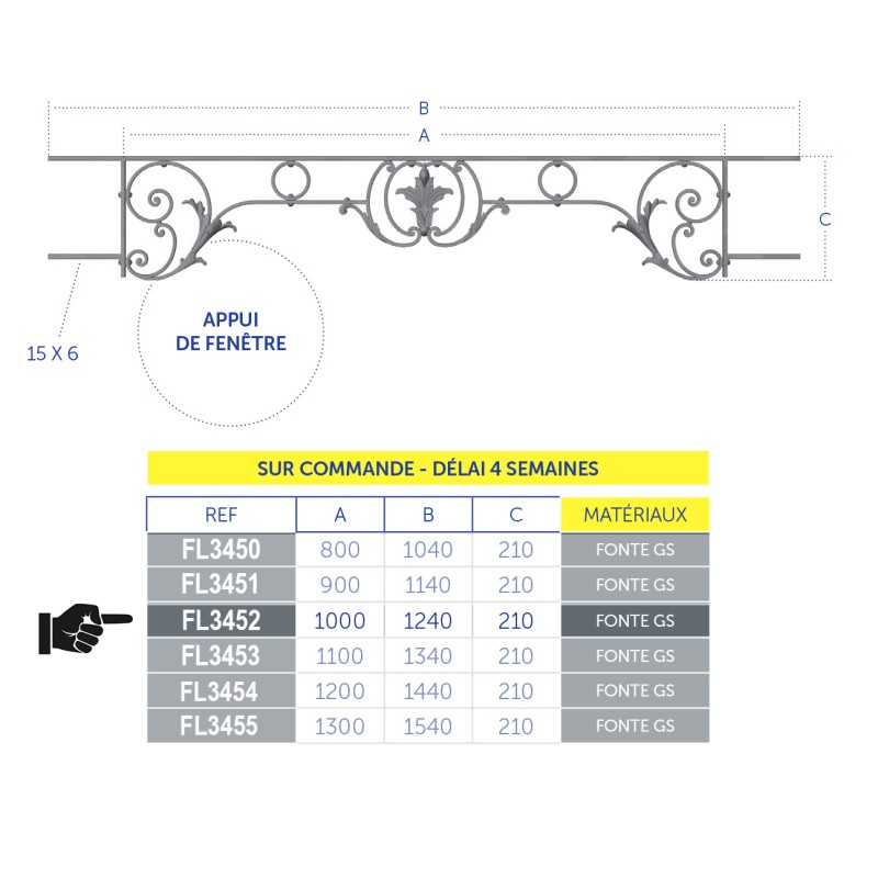 Appui de fenêtre fonte CHAMBORD longueur utile 1000 a 1150mm