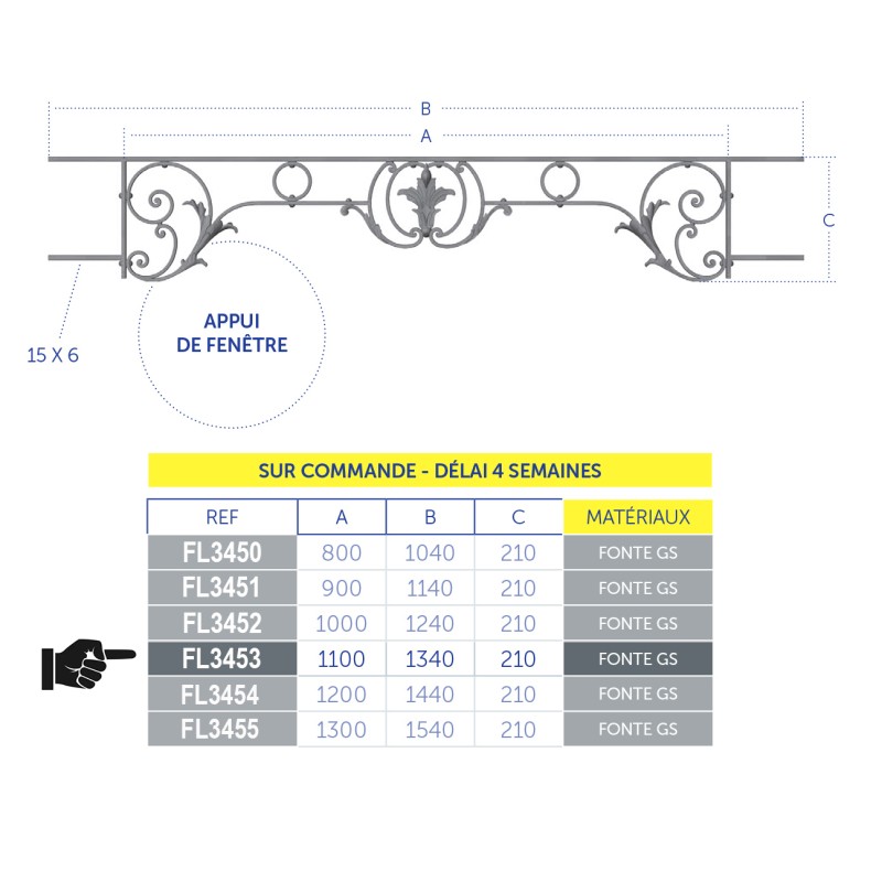 Appui de fenetre fonte modele CHAMBORD longueur utile 1100 a 1250mm