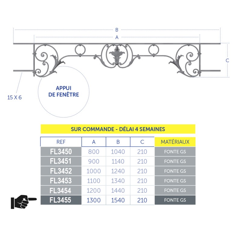 Cet appui de fenêtre en fonte ductile GS est livré prêt à poser en tableau. Ce modèle convient à des fenêtres de largeur 1300 à 1450mm.