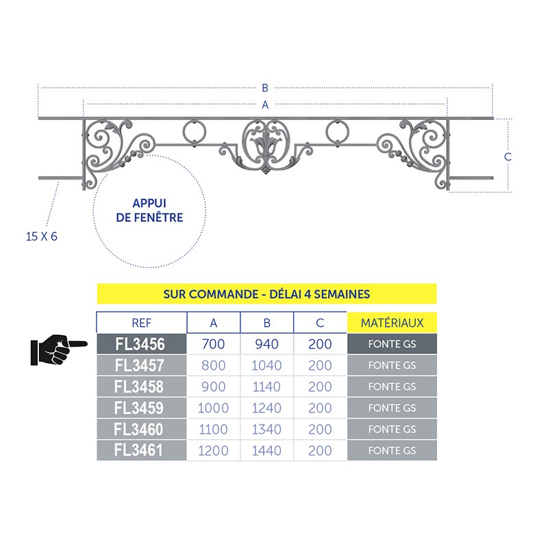 Cet appui de fenêtre en fonte ductile GS est livré prêt à poser en tableau. Ce modèle convient à des fenêtres de largeur 700 à 850mm.
