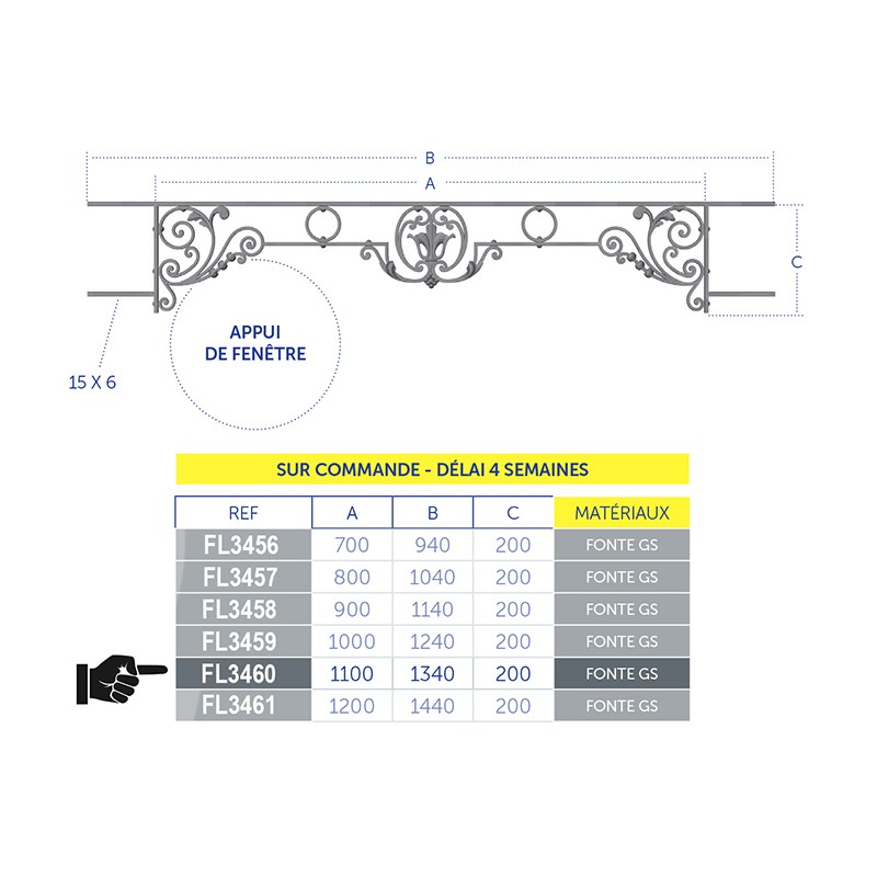Cet appui de fenêtre en fonte ductile GS est livré prêt à poser en tableau. Ce modèle convient à des fenêtres de largeur 1100 à 1250mm.