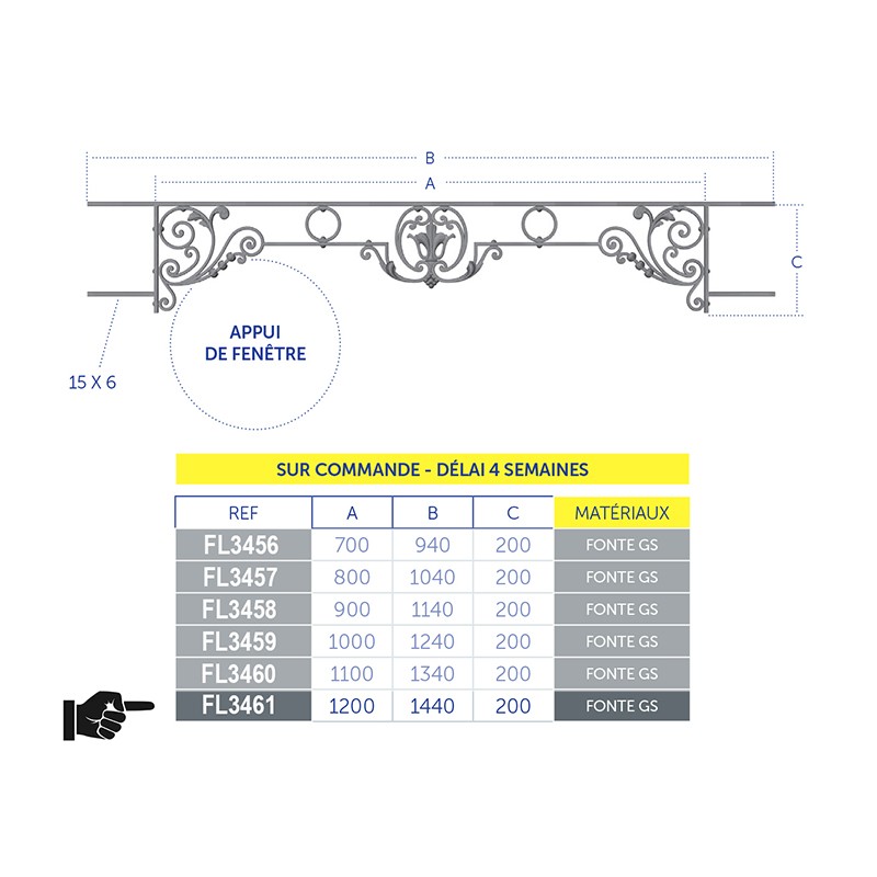 Cet appui de fenêtre en fonte ductile GS est livré prêt à poser en tableau. Ce modèle convient à des fenêtres de largeur 1200 à 1350mm.