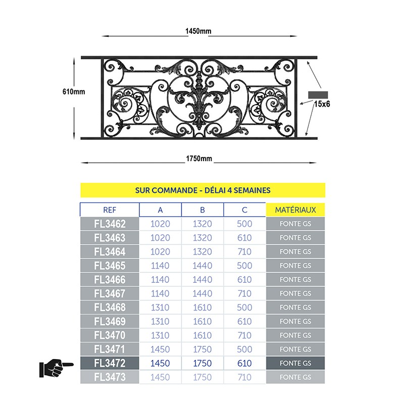 Cet appui de fenêtre existe également dans la même largeur en hauteur 500mm (ref FL3471) et en hauteur 710mm (ref FL3473).