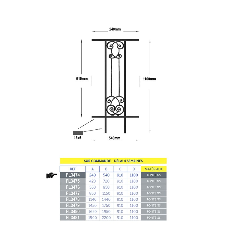Balustrade en fonte AMBOISE longueur utile 240 à 450mm hauteur du motif 910mm