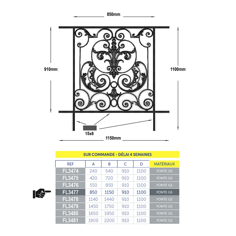 Balustrade AMBOISE longueur utile 850 à 1050mm hauteur du motif 910mm