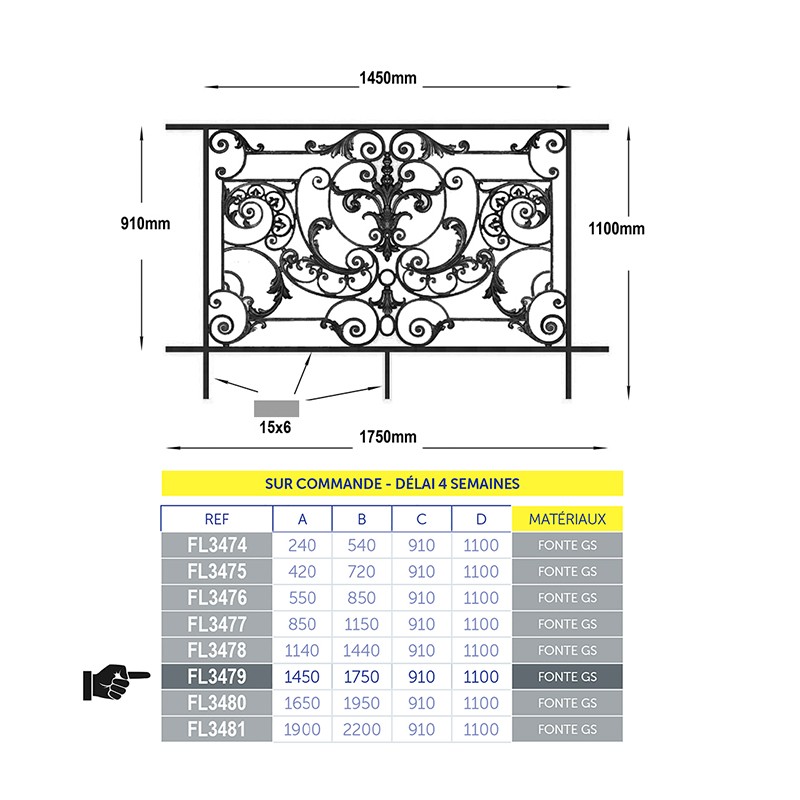 Balustrade AMBOISE longueur utile 1500 à 1650mm hauteur du motif 910mm