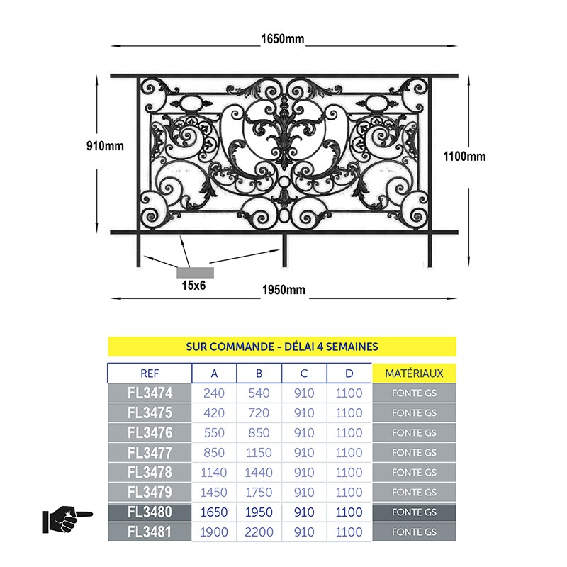 Cet appui de fenêtre existe également dans la même hauteur en longueur du motif 240, 420, 550, 850, 1140, 1450, 1650, 1900mm (ref FL3474 à FL3481). Ces longueurs permettent des assemblages bouts à bouts pour obtenir des balustrades de plus grandes longueurs.