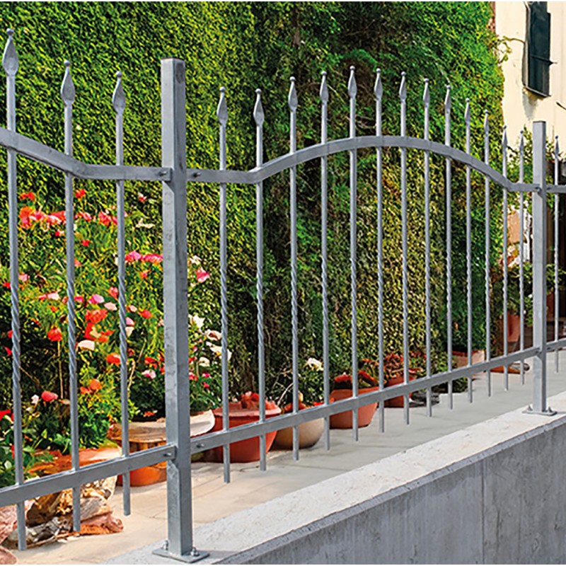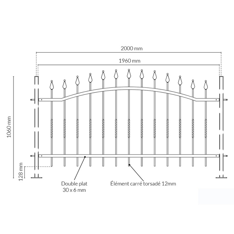 Grille de clôture en acier. Elément de L1960 x H1050 environ composé de 13 balustres coiffés d'une pointe de lance forgée.
