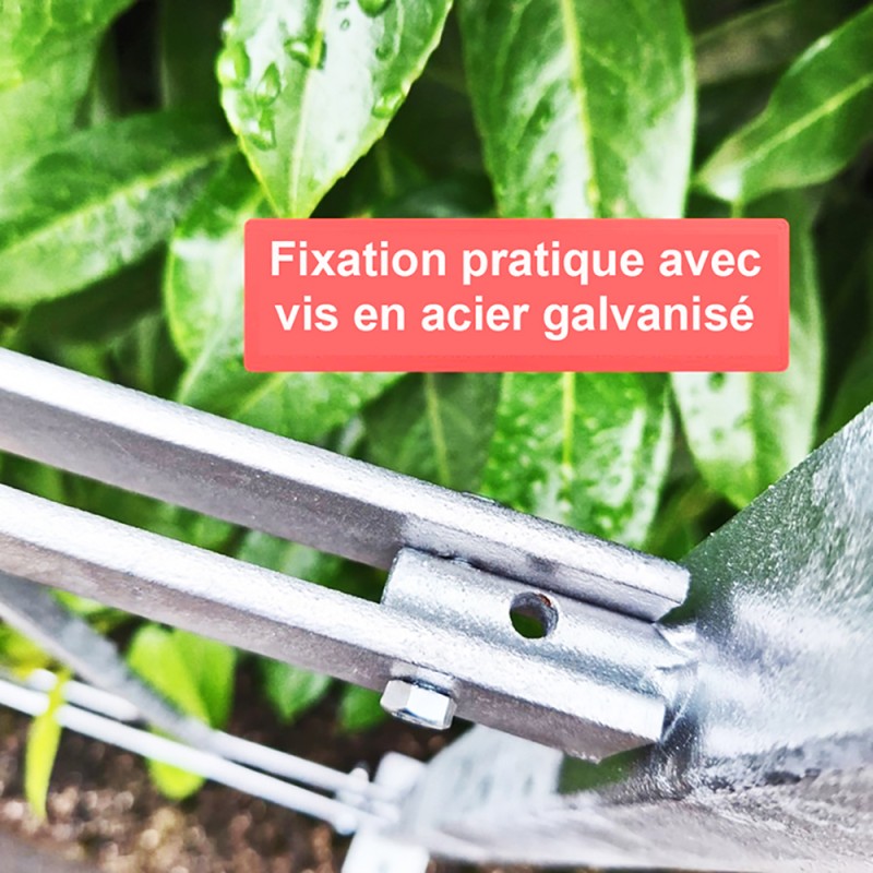 La fixation de la clôture sur les poteaux se fait au moyen de boulons en acier galvanisés livrés avec les poteaux.