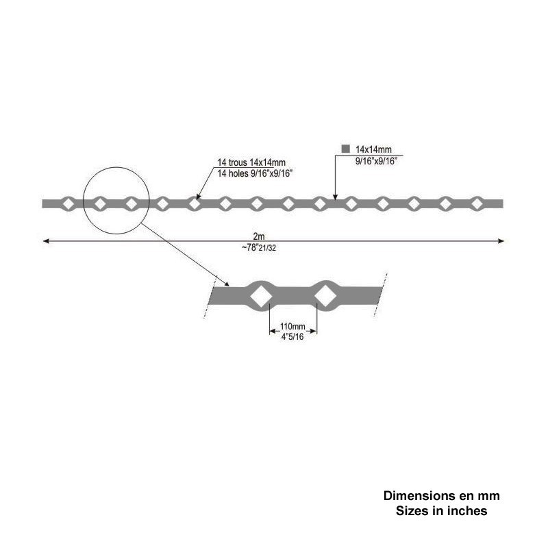 Barre de 14x14mm à 14 trous carrés en losange renflés pour barres de 14x14mm, longueur 2 mètres.