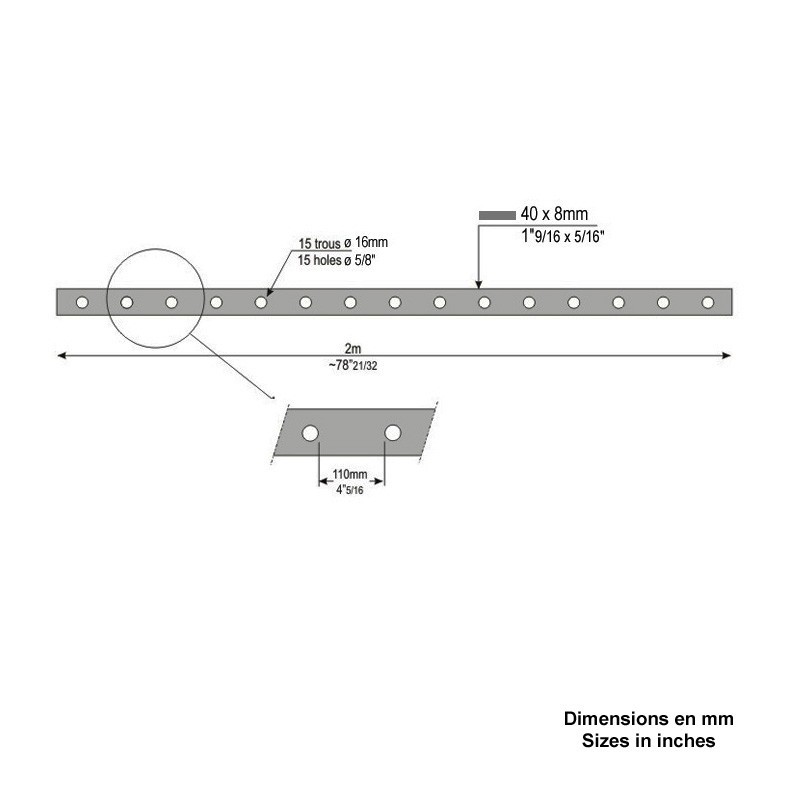 Barre en plat de 40x8 à 15 trous ronds pour barreaux de Ø 16m longueur 2 mètres. Écartement entre barreaux standard de 110mm