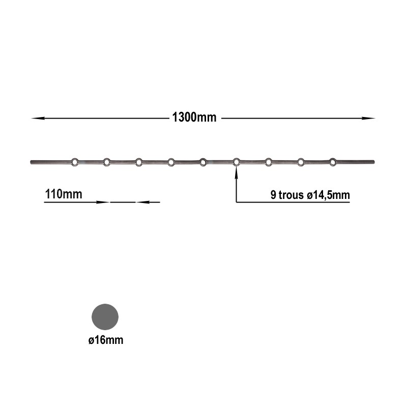 Barre à trous renflés de ø16mm à 9 trous ronds pour barreaux de ø16mm, longueur 1300mm. Écartement entre barreaux de 110mm.