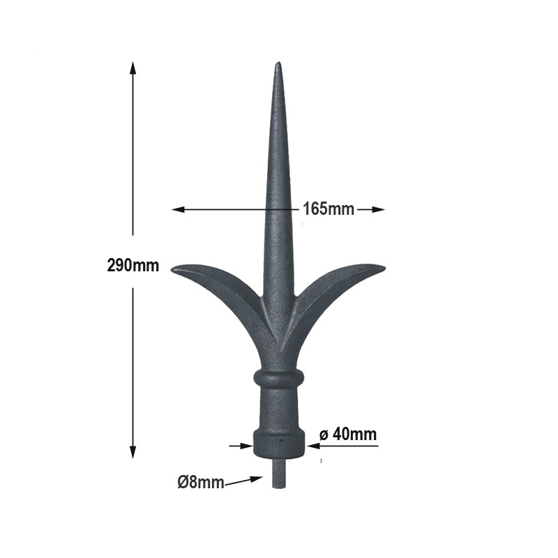 Cette pointe de lance est en fonte non soudable. Elle convient à des poteaux en fer rond de diamètre 25 à 30mm. Elle est fabriquée et livrée sans orifice. Mais elle est dotée d'un pion de centrage en acier Ø8mm environ afin de permettre une pose à la fois simple et facile. Cette pointe de lance en fonte ne peut pas recevoir de traitement par galvanisation.