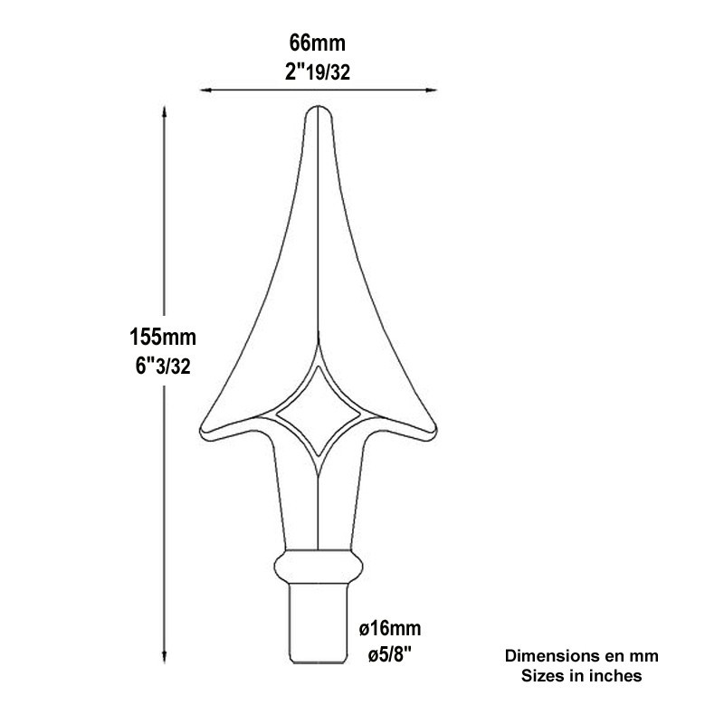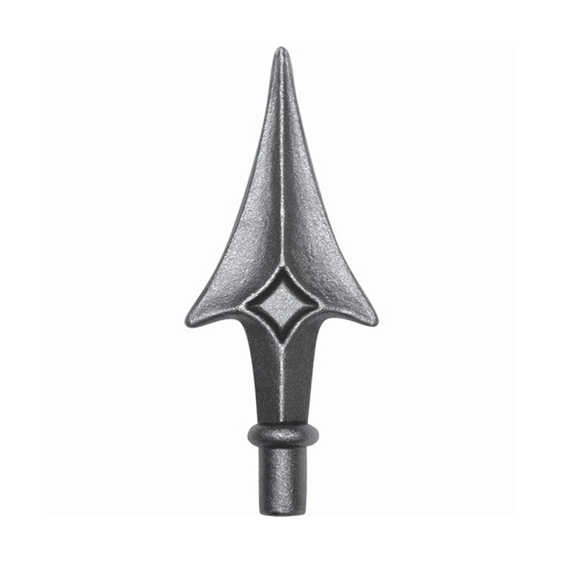 Sa ligne rappelle les pointes de flèches. Cette pointe de lance en fer forgé au graphisme résument contemporain est pleine et à souder en bout. Elle convient bien à des balustres de 16mm. Elle est fabriquée et livrée sans orifice.