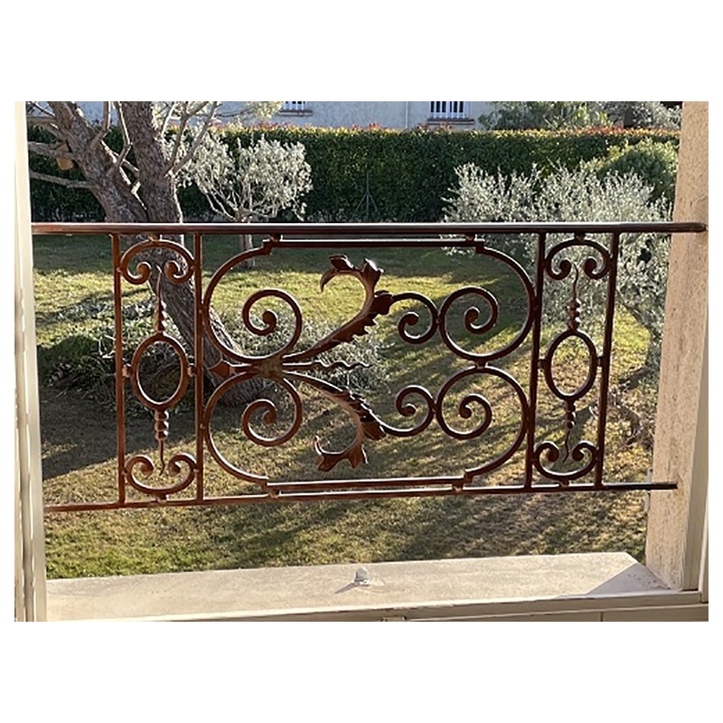 Ce panneau décoratif style art-déco assemblé est forgé à chaud avec les extrémités des volutes martelées en enroulement façon noyaux.