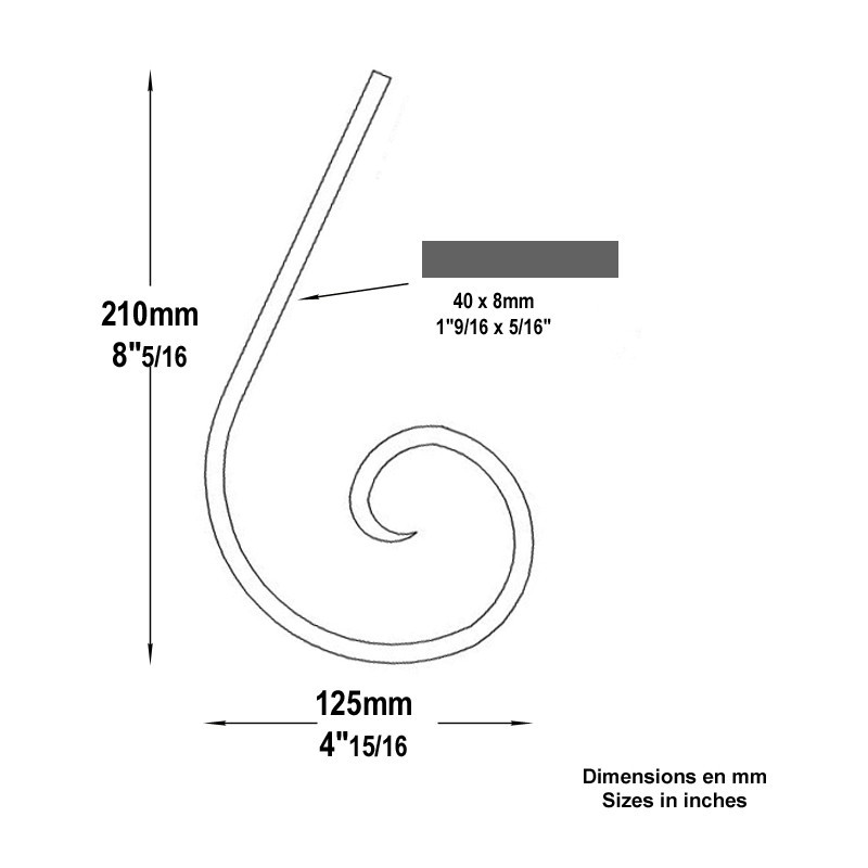 Cette volute demi Cest en acier forgé à chaud de 40x8mm. Les extrémités sont forgées en forme de patte d'oie.