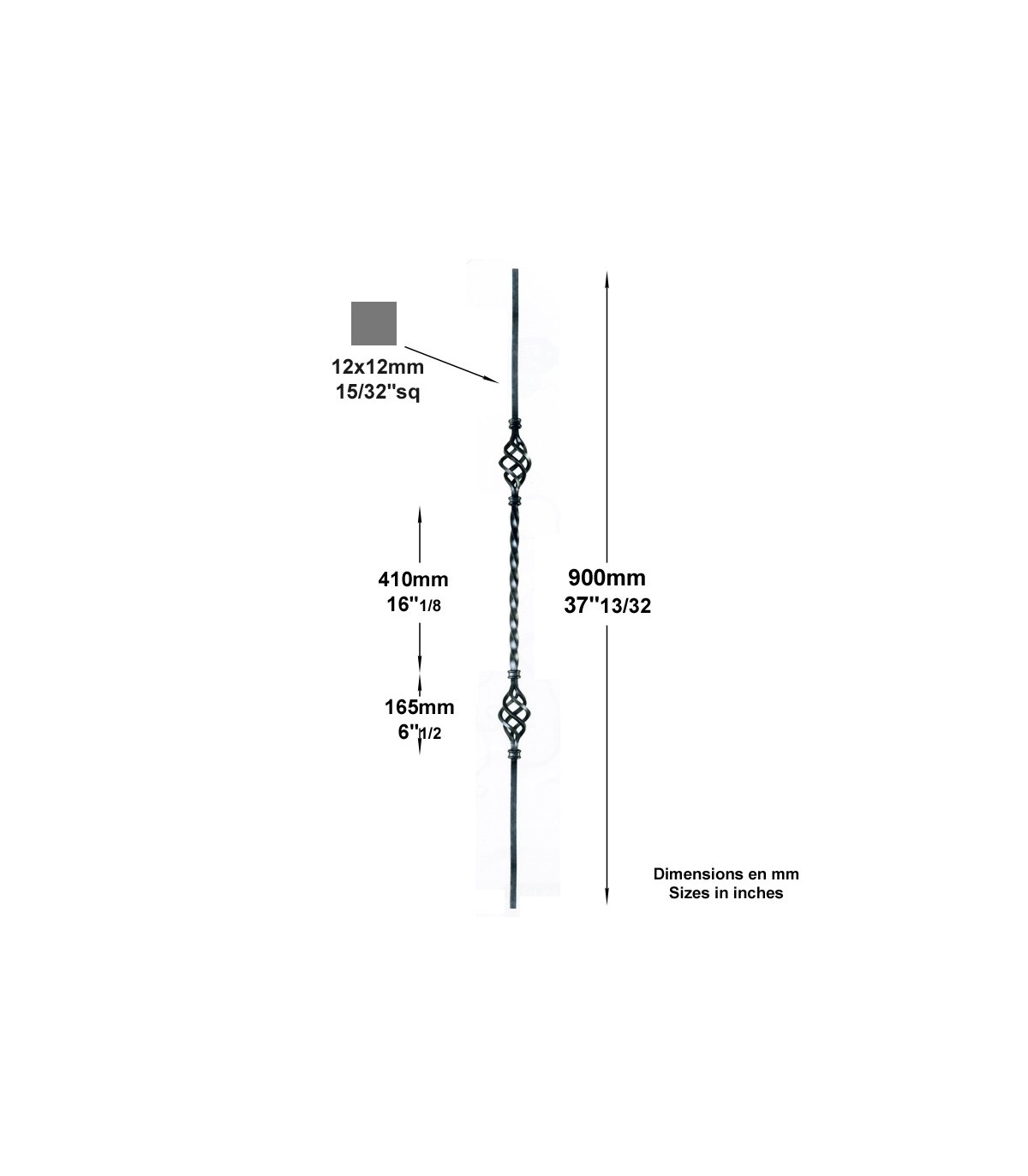 Ce balustre avec torsade centrale effectuée à froid est équipé de deux pignes de 165mm de hauteur. Très utilisé par les métalliers dans la conception de garde-corps et d'escaliers. Ce balustre existe avec une seule pigne, voir article référence FG2563.
