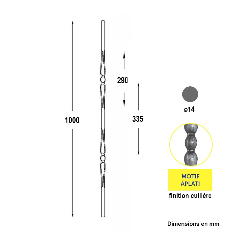 Balustre en rond diamètre 14mm martelé à chaud, hauteur 1000mm.