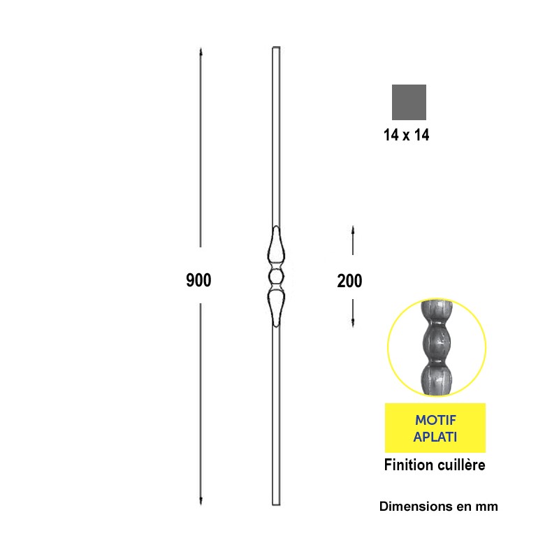 Balustre en carré de 14x14mm martelé à chaud, hauteur 900mm, ce modèle existe également en carré de 12x12mm et 16x16mm et en longueur 1000 et 1200mm. Nous consulter.