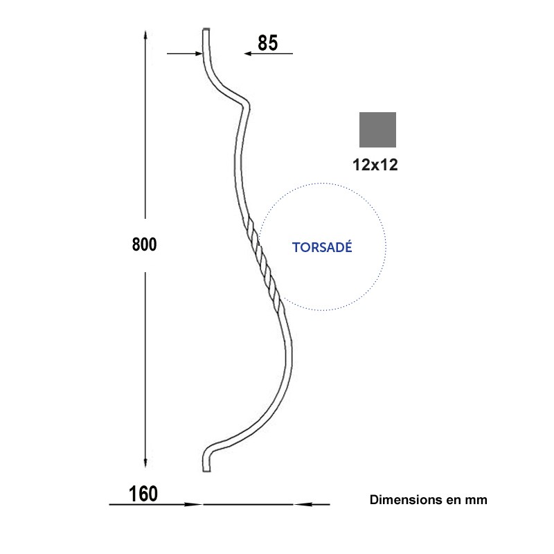 Balustre en carré lisse de 12x12mm galbé et torsadé, hauteur 800x160mm Ce balustre existe également en hauteur 900mm. Voir article FG2606.