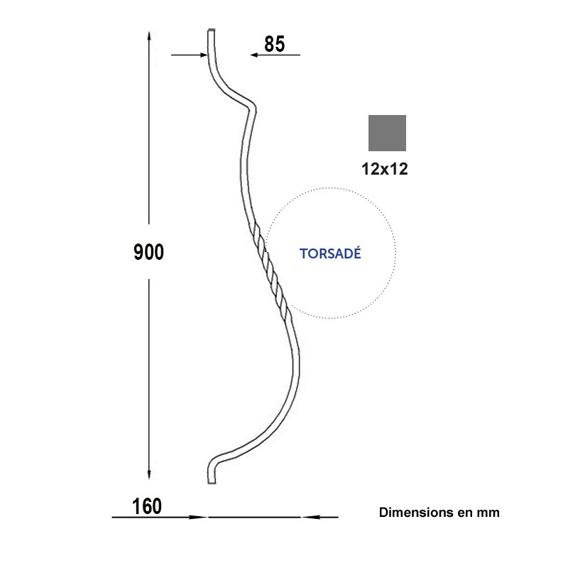 Balustre en carré lisse de 12x12mm galbé et torsadé, hauteur 900x160mm Ce balustre existe également en hauteur 800mm. Voir article FG2605.